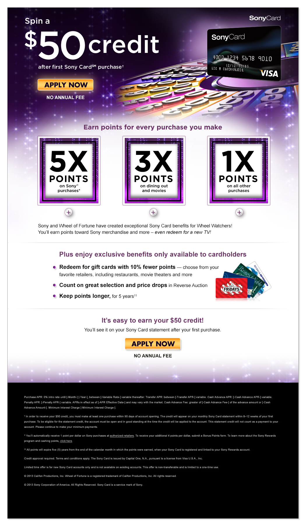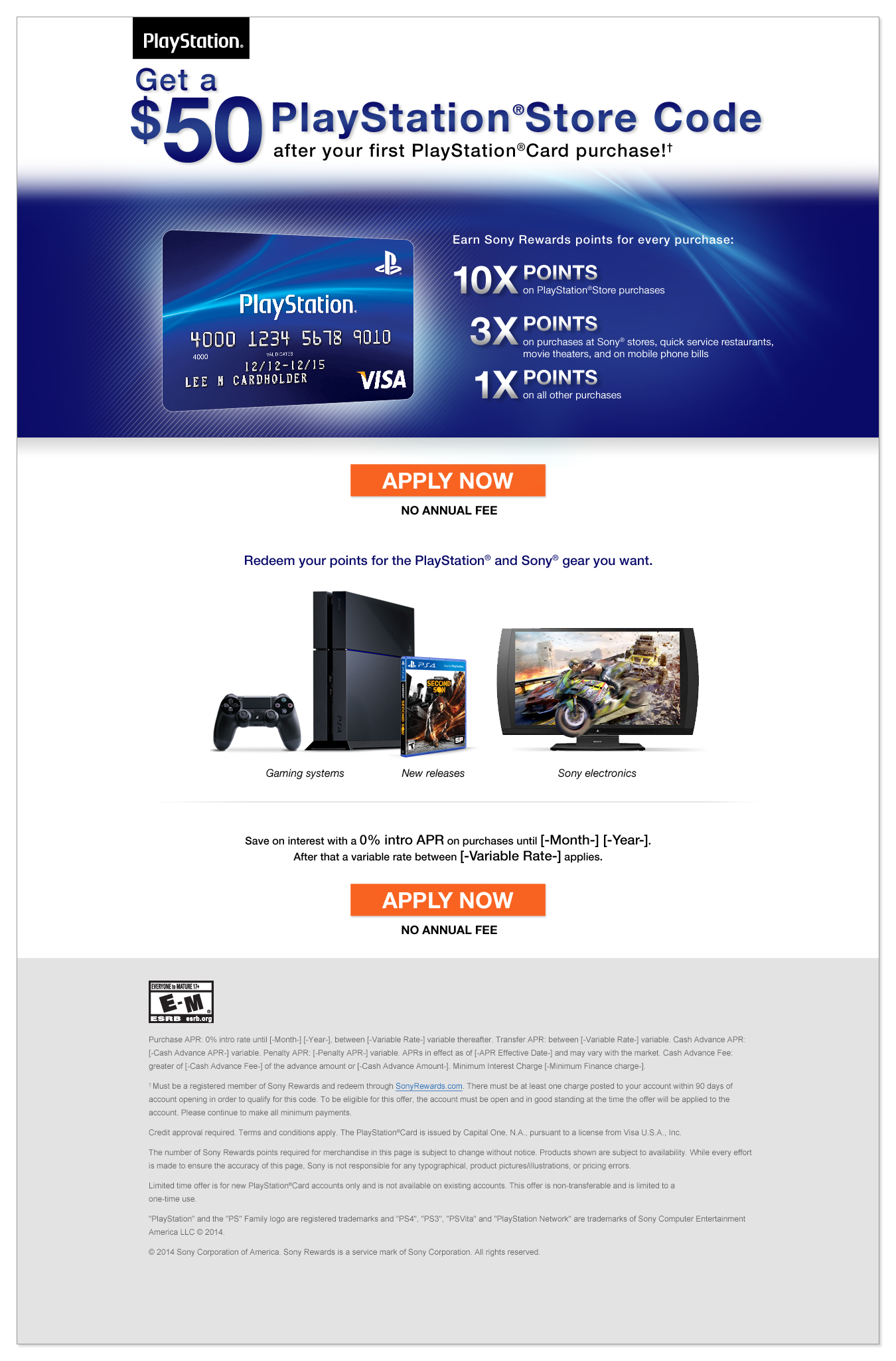 As part of a large and talented team within an agency setting, I developed campaigns and concepts for consumer credit card acquisitions, mostly Sony Card. The reach included Playstation® 3 and the new launch of PS4™, Wheel Watchers Club, Points Plus, Capital One®, and more. The ideation, designs and presentations to the Sony® team (done remotely) were largely focused on sets of both desktop and mobile versions of landing pages, emails, banners and player console ads.